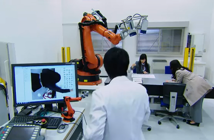 湯川准教授(福山雅治)が、振り子を使って殺人犯の名前を言い当てた少女(川口春奈)の腕の動きを、やけに大掛かりな装置で分析しています。(下の写真)